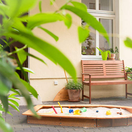 Für gemeinsame Ausflüge steht ein Vierlingsbuggy zur Verfügung. In unserem Garten gibt es eine Buddelkiste und diverse Außenspielzeuge. Im Sommer freuen sich die Kinder auf das gemeinsame Blumengießen und Wasserspiele. In der Natur lernen die kleinen Forscher Flora und Fauna kennen. Auch ein Berliner Hinterhofgarten bietet eine erstaunliche Vielfalt an Pflanzen, Käfern, Asseln, Vögeln, Regenwürmern und - zum Leidwesen der Gartenbesitzer - Schnecken. Im Spiel mit Naturmaterialien können die Kinder ihrer Phantasie freien Lauf lassen. Die Bewegung im Freien schult die Motorik und „gelüftete“ Kinder sind ausgeglichen. In Auseinandersetzung mit ihrer Umwelt lernen bereits kleine Kinder Mengen und deren Zuordnung einzuschätzen.